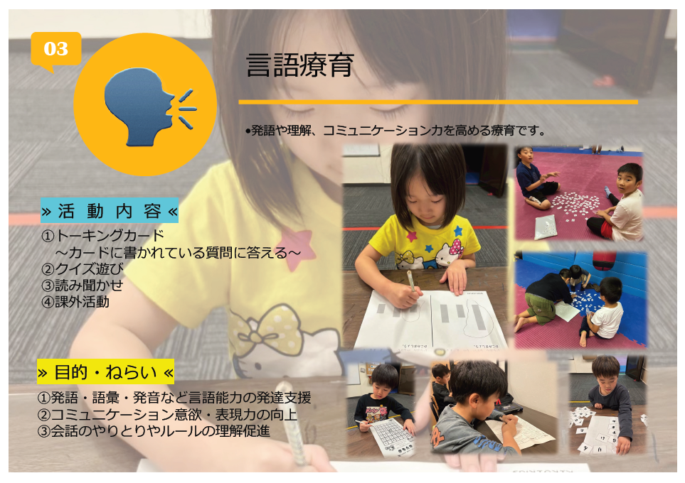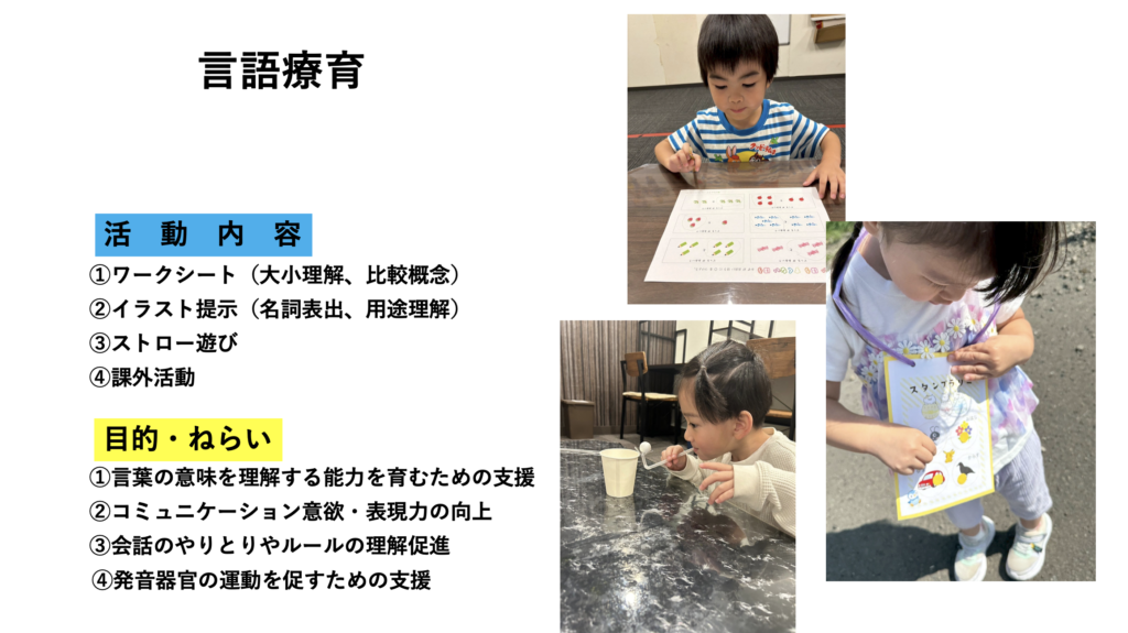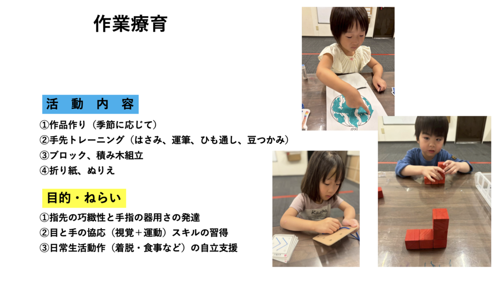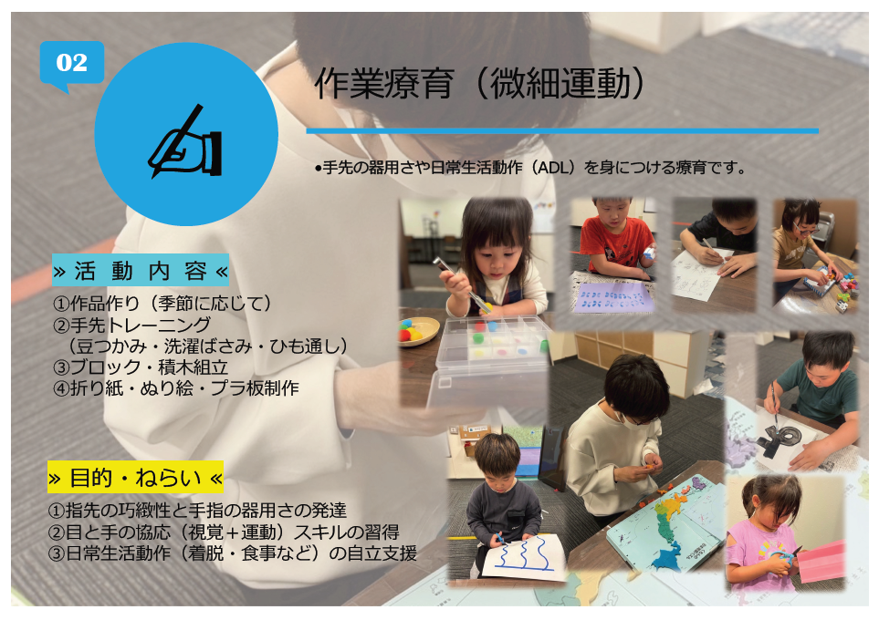 また、就学へ向けた学習の土台となる文字や数の数え方、手先や体の使い方、運動できる体力の土台づくりにも取り組んでいきます。
