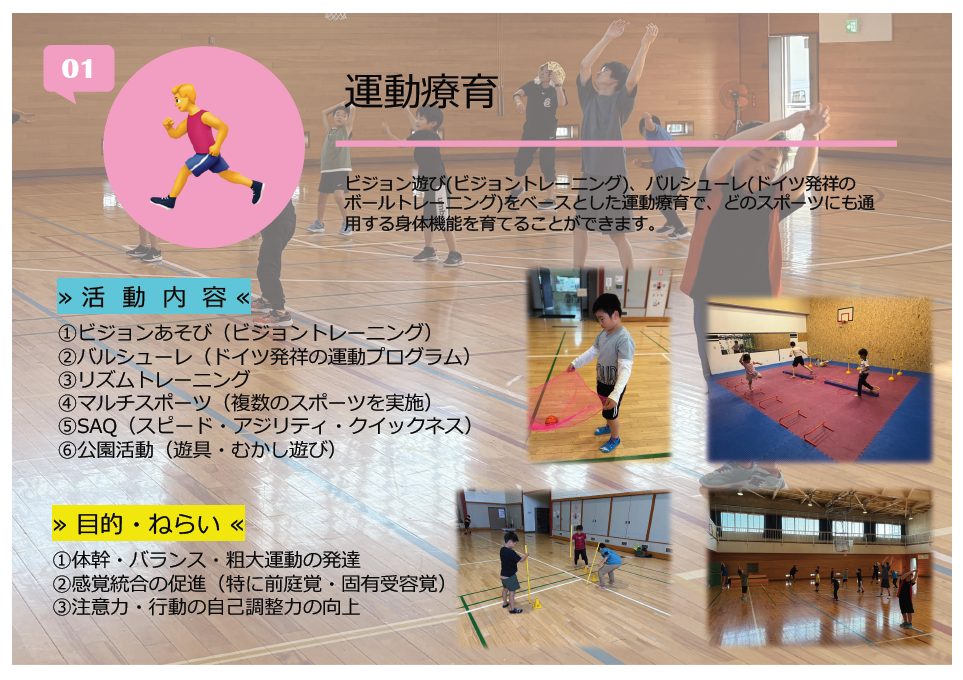 また、胎児の段階から備わる原始反射(本能)が残存すると運動能力を阻害するともいわれています。当施設のプログラムは、それらの課題を見つけ改善・解消に向けた取り組みをおこないます。