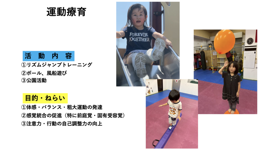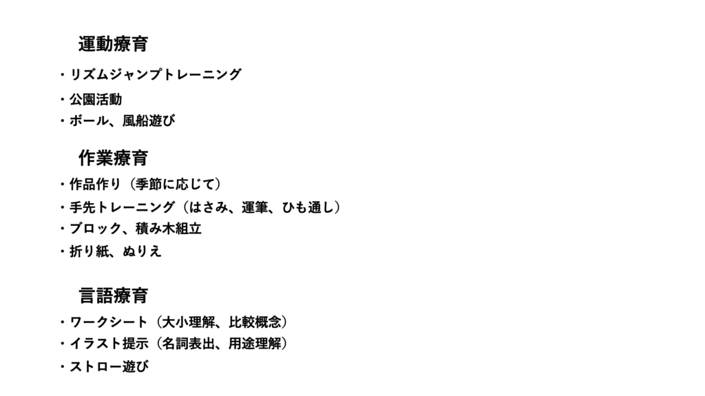 基本は子どもと楽しく遊ぶお仕事です。身体を動かすことをメインとしています。支援方法などは、社内研修などでみんなで学んでいきます。